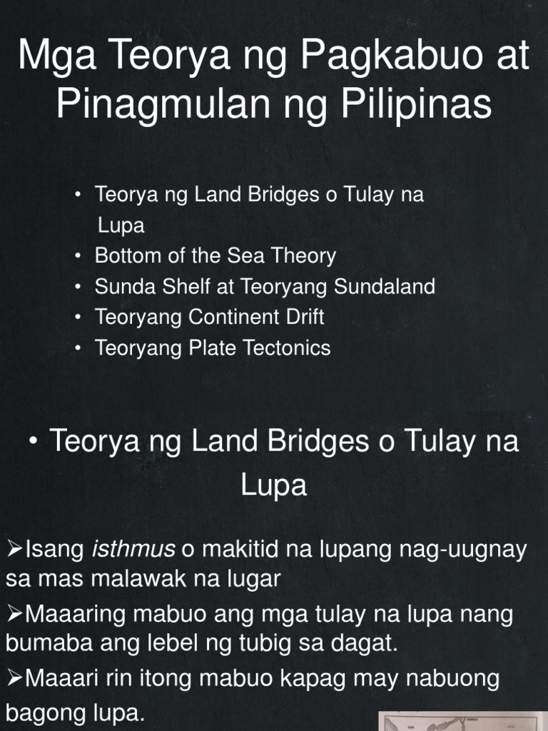 Teorya ng pinagmulan ng pilipinas 1. Sa pagtatapos ng Panahon ng Yelo ang tulay na lupa ay nahubog bunga ng paglusaw ng malalaking tipak ng yelo. Ito ay isang malaking nakausling bahagi ng Asia sa pagtatapos ng panahon ng yelo.