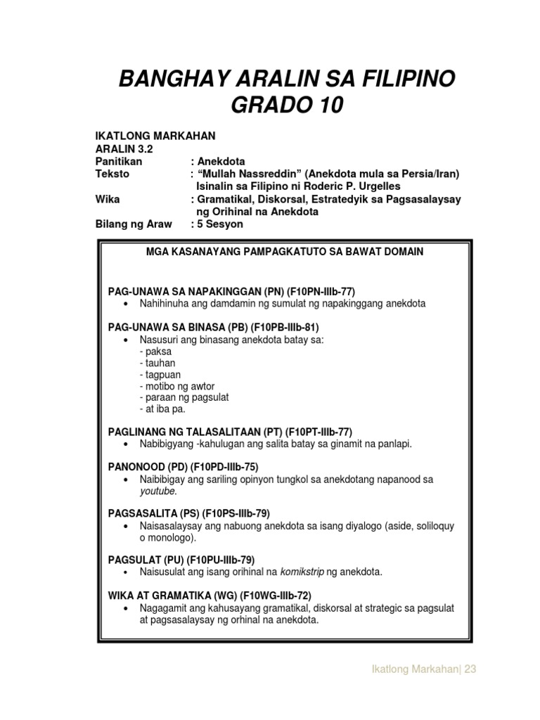 Suriin ang mahalagang bahagi ng Anekdota Mullah Nassreddin Gawin ito sa pamamagitan ng pagbuo ng tsart na nasa ibaba MULLAH NASSREDDIN PANIMULA. Ang mga modyul na ito ay magkatuwang na inihanda at sinuri ng mga edukador mula sa mga publiko at pribadong paaralan at pamantasan. Ang tubig sa wawa ay napapaligiran ng mga kawayang.