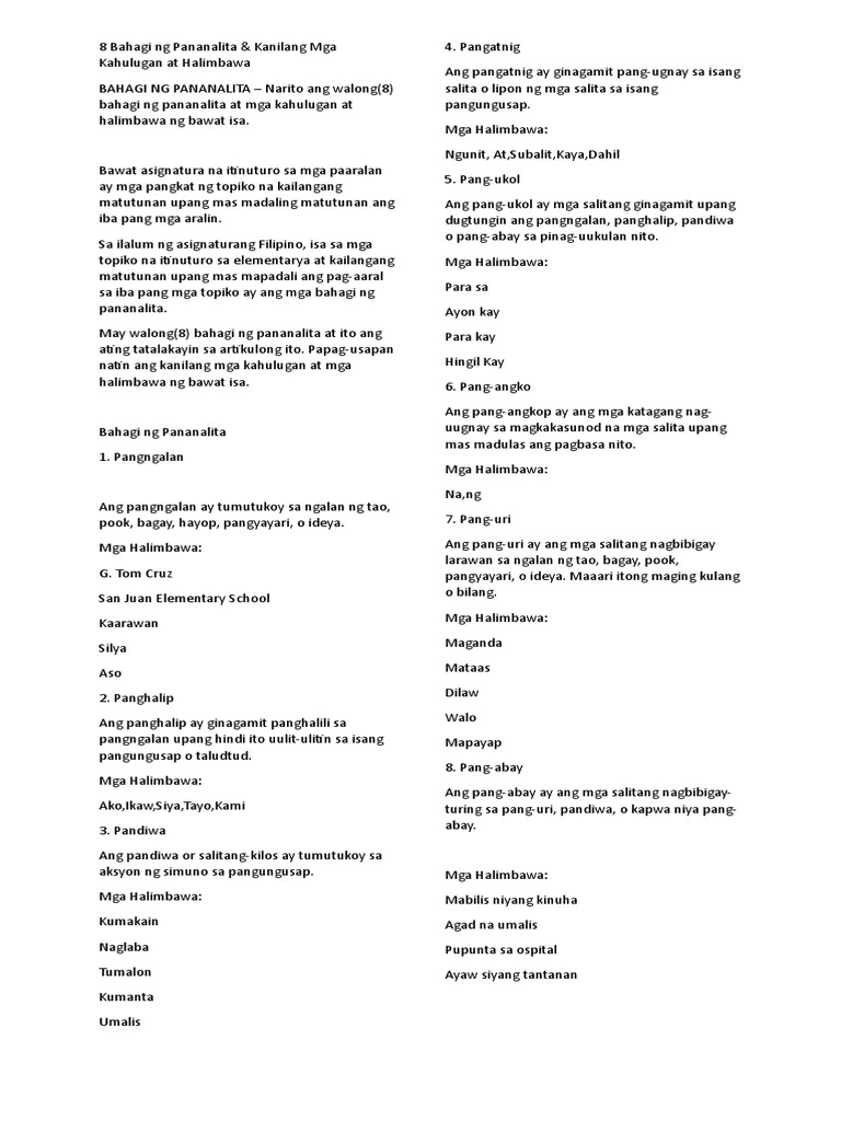 Walong bahagi ng pananalita at halimbawa. In the english language there are 9 Parts of Speech. Pangngalan -Ang Pangngalan ay ngalan ng tao lugar bagay gawa o pangyayari. Mayroon tayong walong8 bahagi ng pananalita.